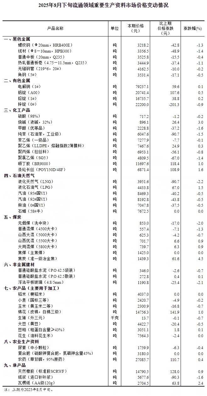 原标题:2025年8月下旬流通领域重要生产资料市场价格变动情况